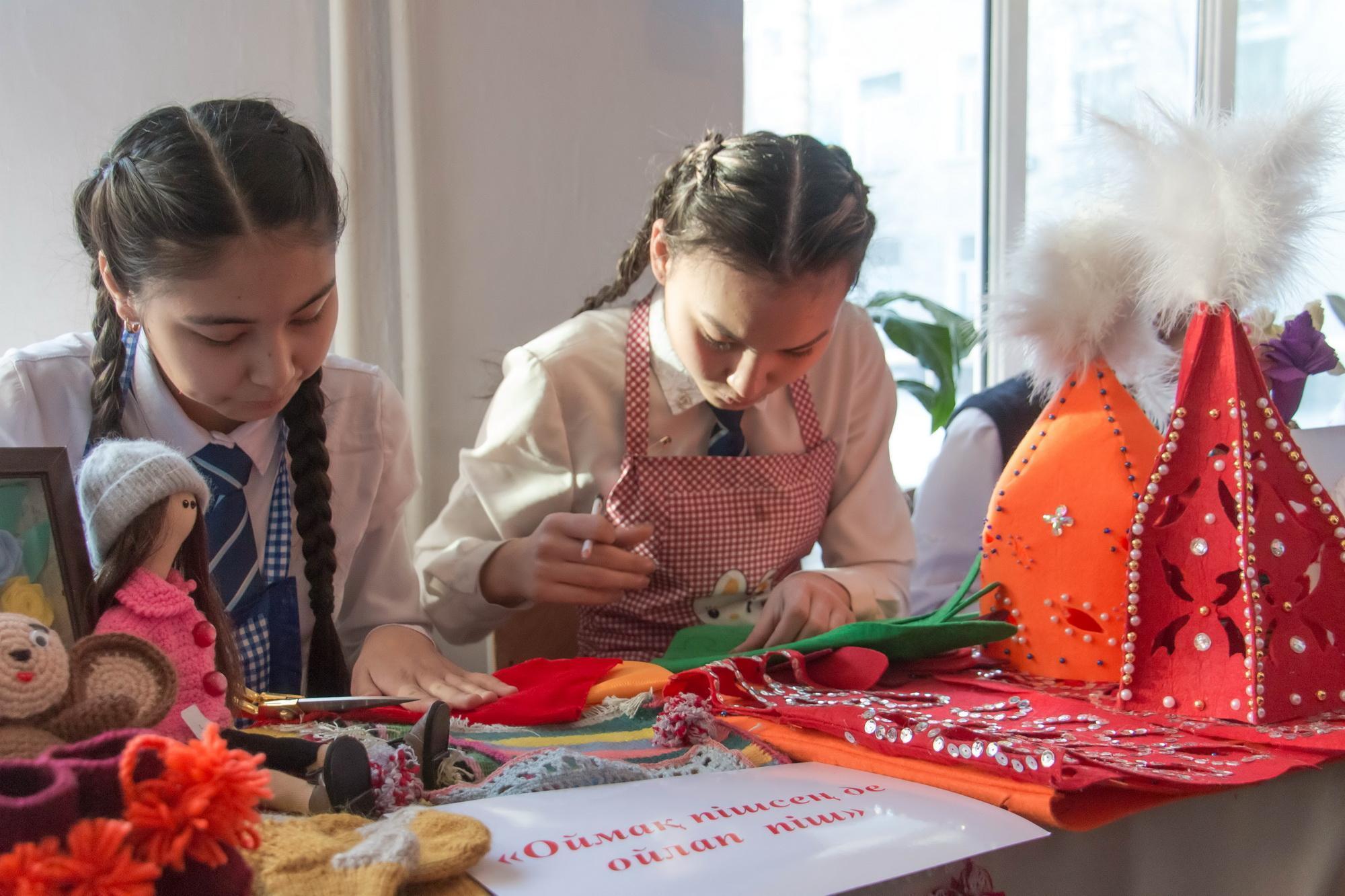«Оймақ пішсең де ойлап піш» көрмесінде фетра матаны өңдеу технологиясы жүнді өңдеу технологиясымен бірдей болып келетінін, бұл материалды көбіне әйел адамның аксессуарларларына, брош, қалпақ, жасауға қолданатынын, фетраның түрлеріне тоқталды. Осы күндері кеңінен таралған фетра матасынан жасалған заттарды ұсынды. Мектептің оркестрінің орындауында «Келіншек» күйі мен «Көрпе» биін орындалуын тамашалады. Бірінші бөлімге 37 оқушы қатысты.